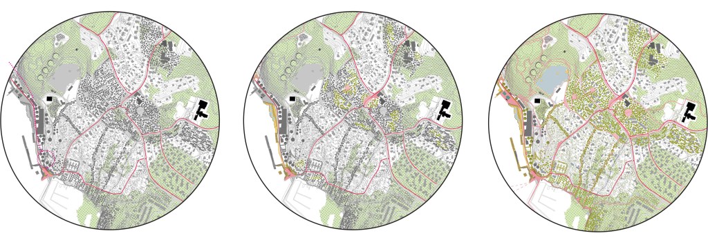 The third phase aims to enhance the connectivity of the five green corridors which will become the new structure for the future city development. New functions are integrated: the rediscovery of the existing flora and fauna, a system of diverse passages to wander between the forest and sea, new activities for a multigenerational and healthy society are strategically placed in Fagerstrand.