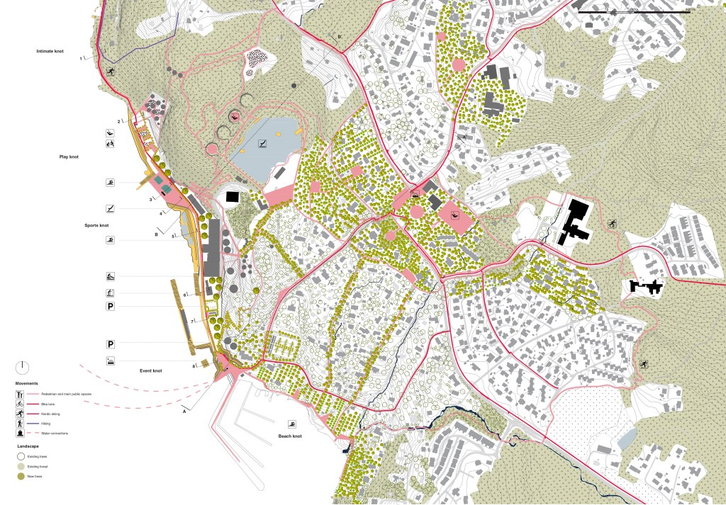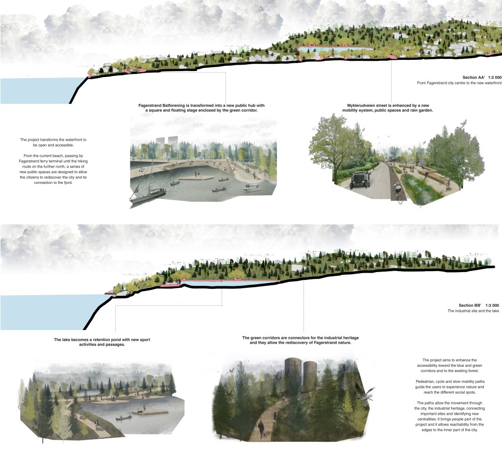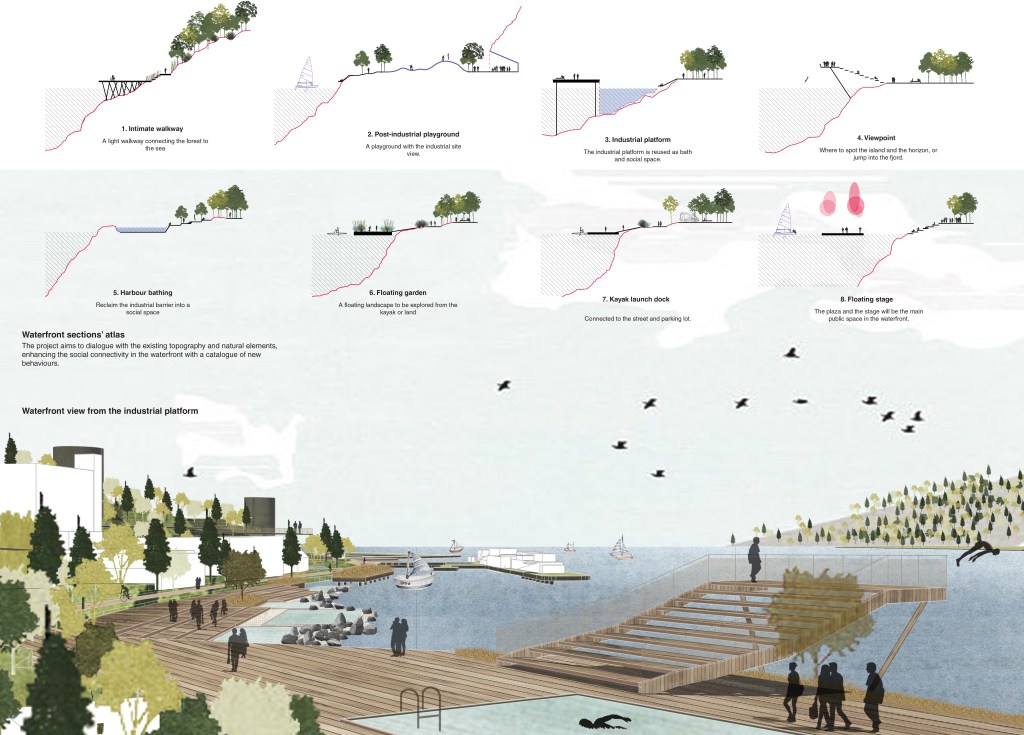 From the current beach, passing by Fagerstrand ferry terminal until the hiking route on the further north, a series of new public spaces are designed to allow the citizens to rediscover the city and its connection to the fjord.