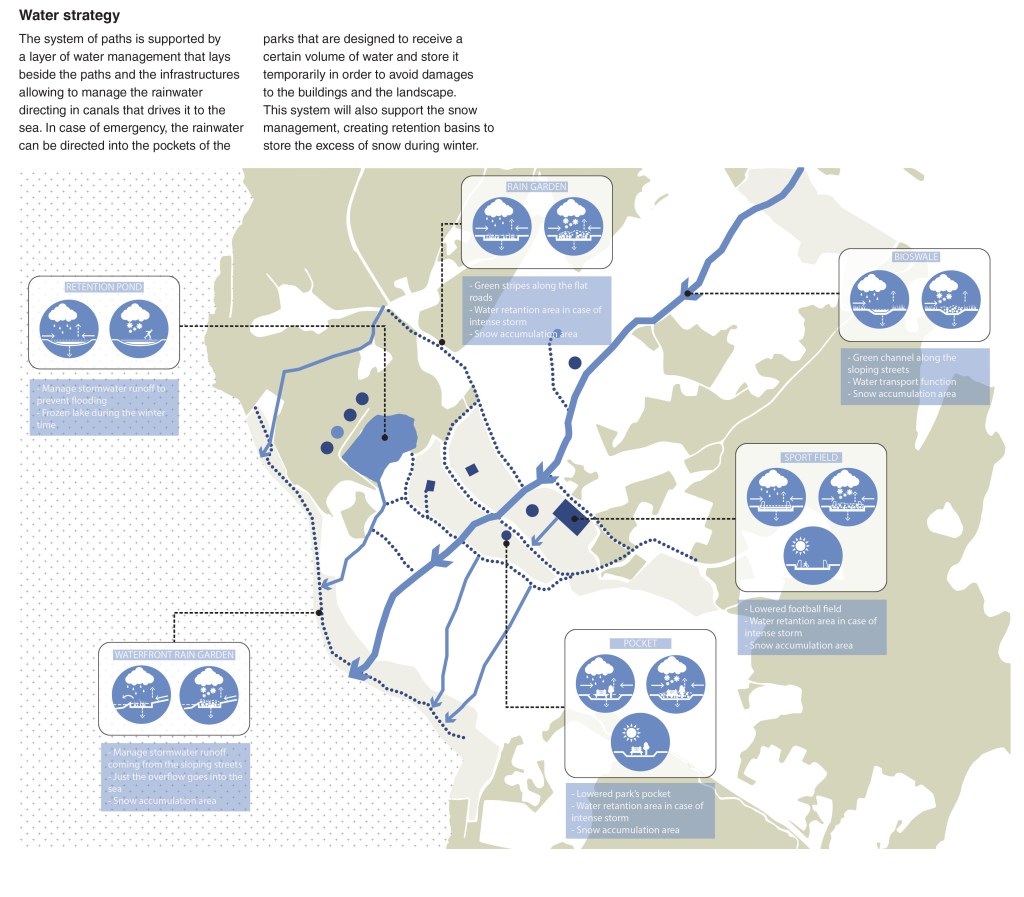 The system of paths is supported by a layer of water management that lays beside the paths and the infrastructures allowing to manage the rainwater directing in canals that drives it to the sea. In case of emergency, the rainwater can be directed into the pockets of the parks that are designed to receive a certain volume of water and store it temporarily in order to avoid damages to the buildings and the landscape. This system will also support the snow management, creating retention basins to store the excess of snow during winter.